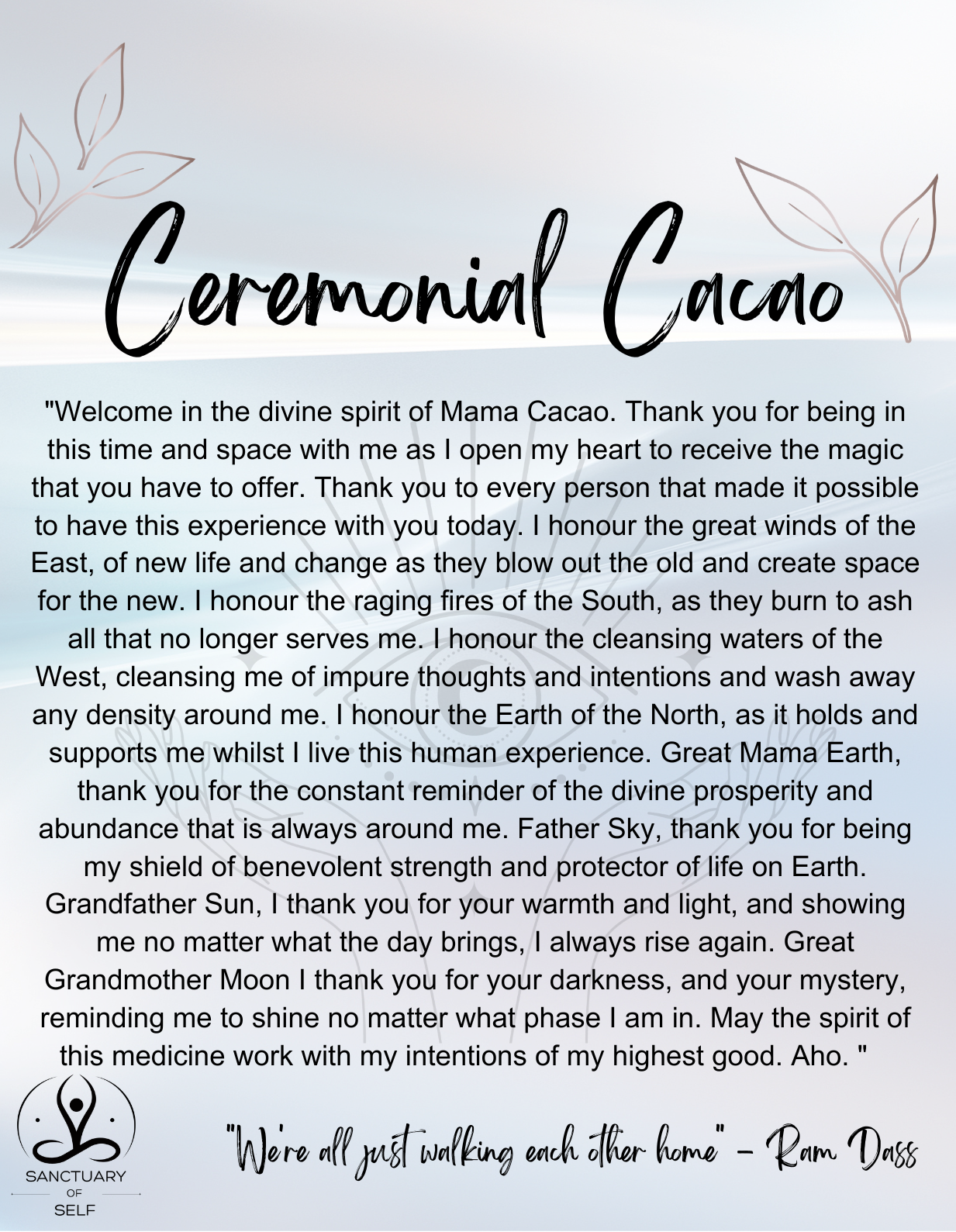 Ceremonial cacao can take you on a journey. By holding an intention and inviting in the Spirit of Cacao, no matter what dose you’re having, will be supportive of your personal and spiritual growth.